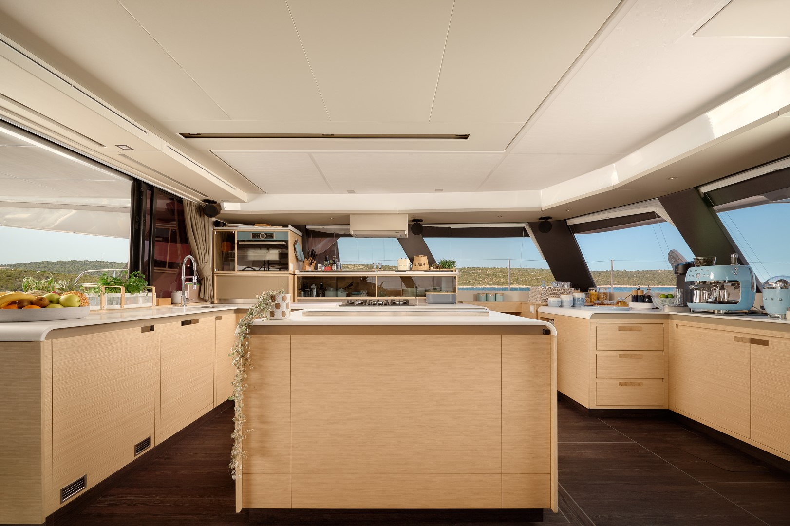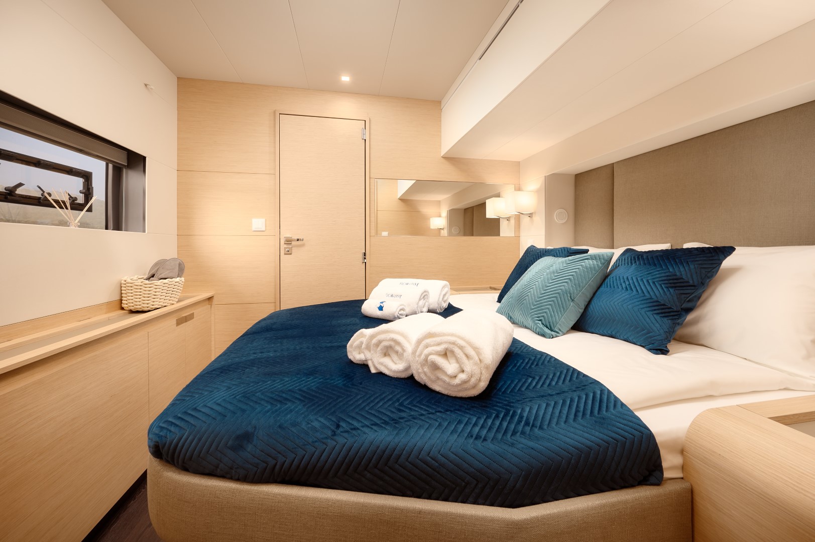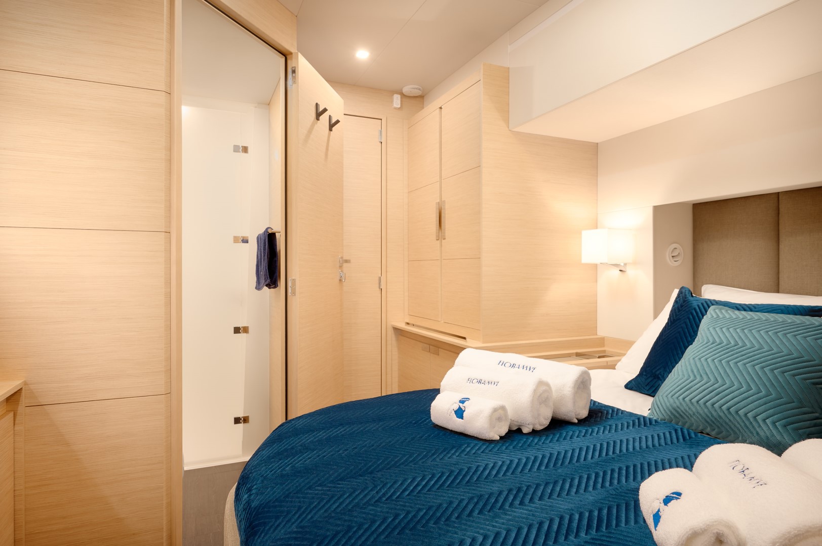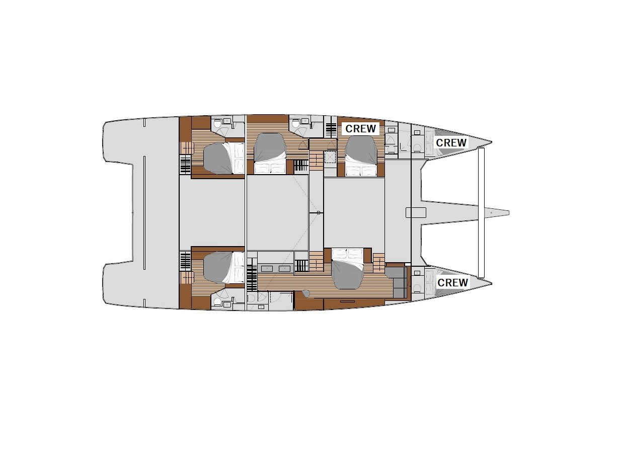 Featuring a 5-cabin layout in the Maestro Version (Galley up), it includes one spacious owner’s suite with a private bathroom, three double guest cabins each with ensuite facilities, and three separate crew cabins.
